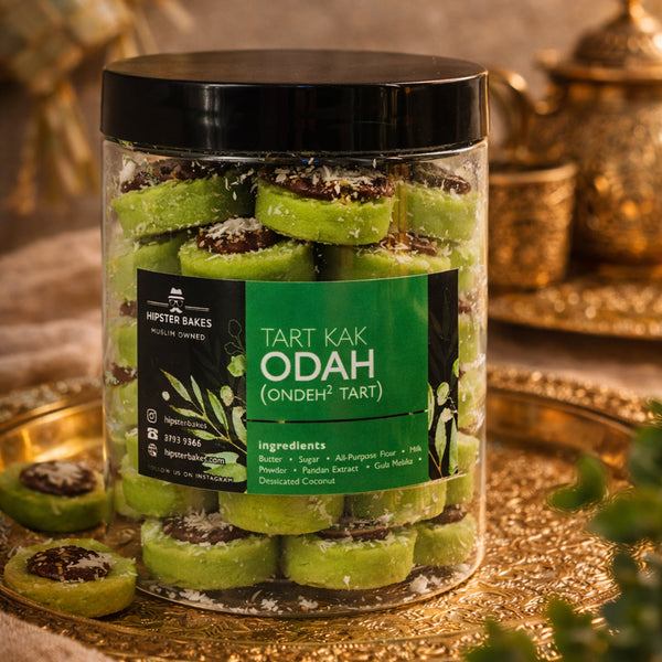 Experience the essence of a classic Malay dessert in cookie form with our Ondeh-Ondeh Tarts. Each of the 50 tarts in this jar is infused with fragrant pandan extract, filled with a rich Gula Melaka center, and topped with a dusting of desiccated coconut. It’s the perfect blend of sweet, salty, and aromatic.